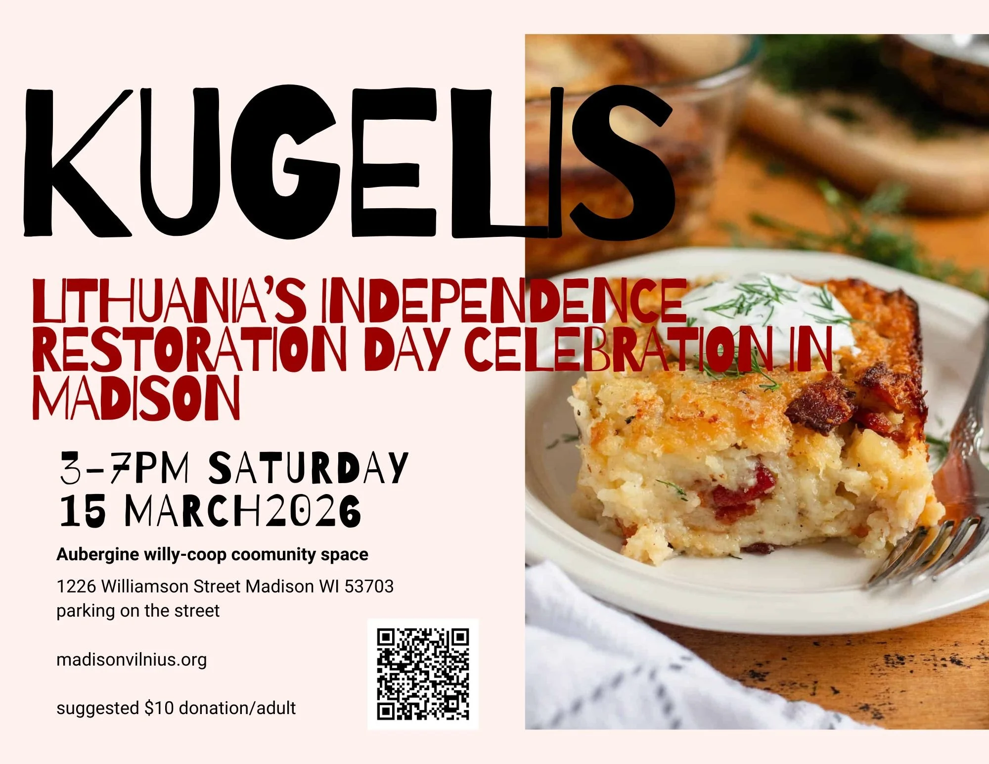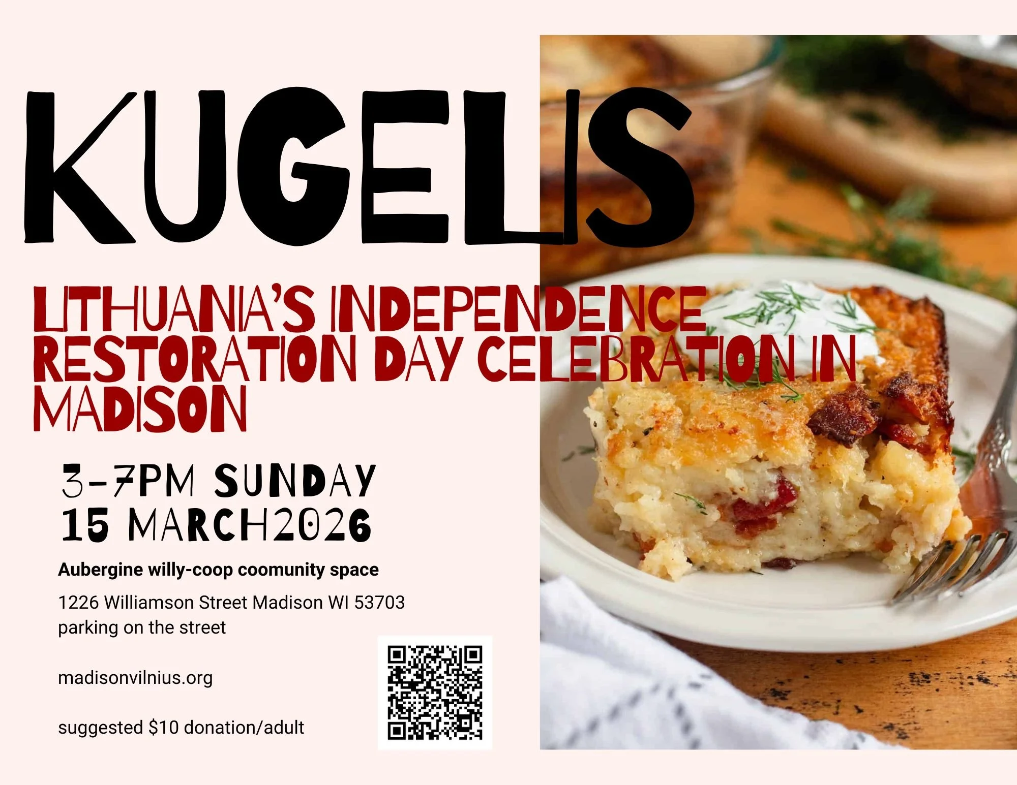 This year Lithuania is celebrating 36, the United States is celebrating 250. There are many years of history to reflect on. Madison Vilnius invites you to come and celebrate these occasions by making Kugelis together.