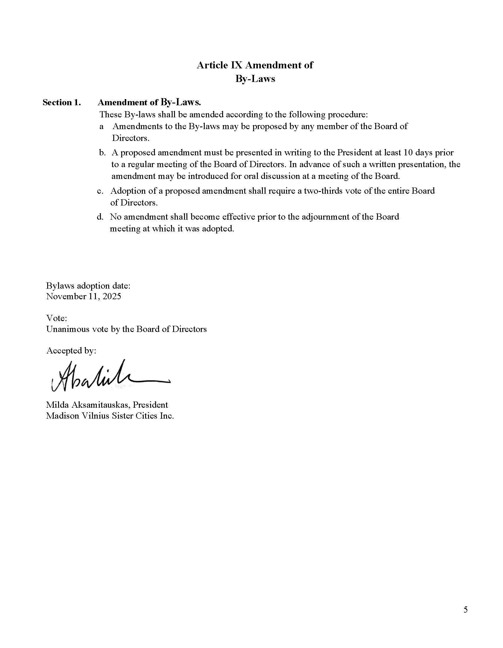 Madison Vilnius Sister City bylaws, 2025 adopted version.